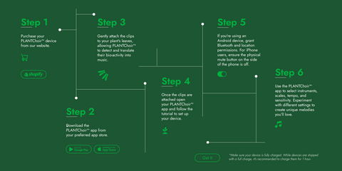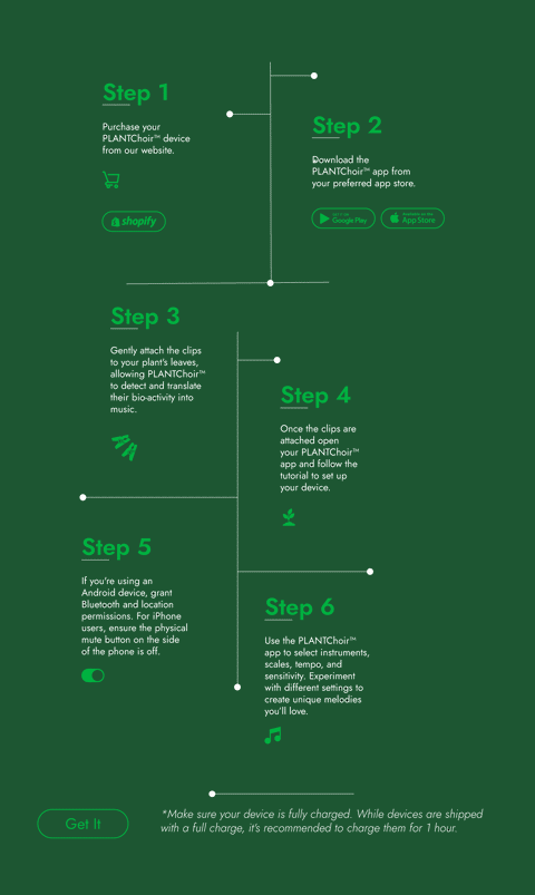 PLANTChoir™ is a small, durable, Bluetooth device that allows you to compose, generate, and listen to real-time music produced by plants. Using biofeedback technology and a custom mobile app, PLANTChoir™ allows you to interact with your plants in a way that has never been experienced before.